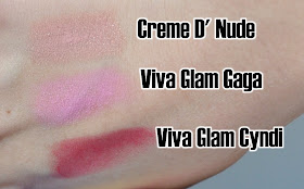 Here we have the Creme D' Nude, Viva Glam Gaga and Viva Glam Cyndi swatches. I was so worried about getting the nude lippie, but it actually looks nice on my lips! Then again I am going through that nude phase :-P Gaga however, does not. It's a bright blue pink lippie but I knew that it probably wouldn't suit, I just bought it because it's Lady Gaga and I love her music. Can't wait to see her in concert this month too! I was fully :-O at the telephone video clip. Ahem. Where was I. The Cyndi lippie is much more wearable (for me at least) and naturally these swatches are quite built up so a bit of a swipe of these lustre lippies isn't going to make you look horrible. I actually stuck the Mary Kay cream & sugar gloss over the gaga lippie and it looked very nice. Speaking of which: